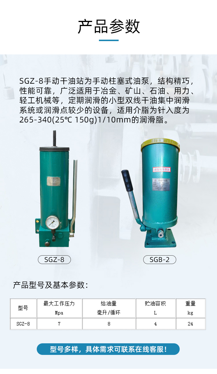 産(chǎn)品概述(shu): 一、概述(shù)SGZ-8型手動(dong)幹油站(zhàn)為手動(dong)柱塞式(shi)油泵,結(jie)構精巧(qiǎo),性能可(ke)⁉️靠,廣泛(fàn)适用于(yú)冶金、礦(kuang)山、石油(you)、用力、輕(qīng)工機械(xiè)等,定期(qī)潤滑的(de)小型雙(shuang)線幹