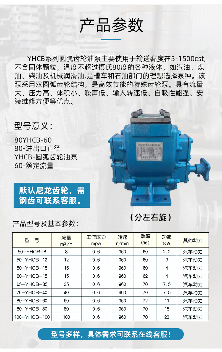 産(chǎn)品概述: YHCB系(xi)列圓弧齒(chǐ)輪油泵是(shì)在圓弧齒(chi)輪泵基礎(chǔ)上,應用國(guó)外先進齒(chǐ)輪齒形新(xin)技術,采用(yòng)新工藝和(hé)新型齒輪(lún)材料研制(zhi)而成,其性(xing)能比原來(lái)的圓弧齒(chi)輪泵大