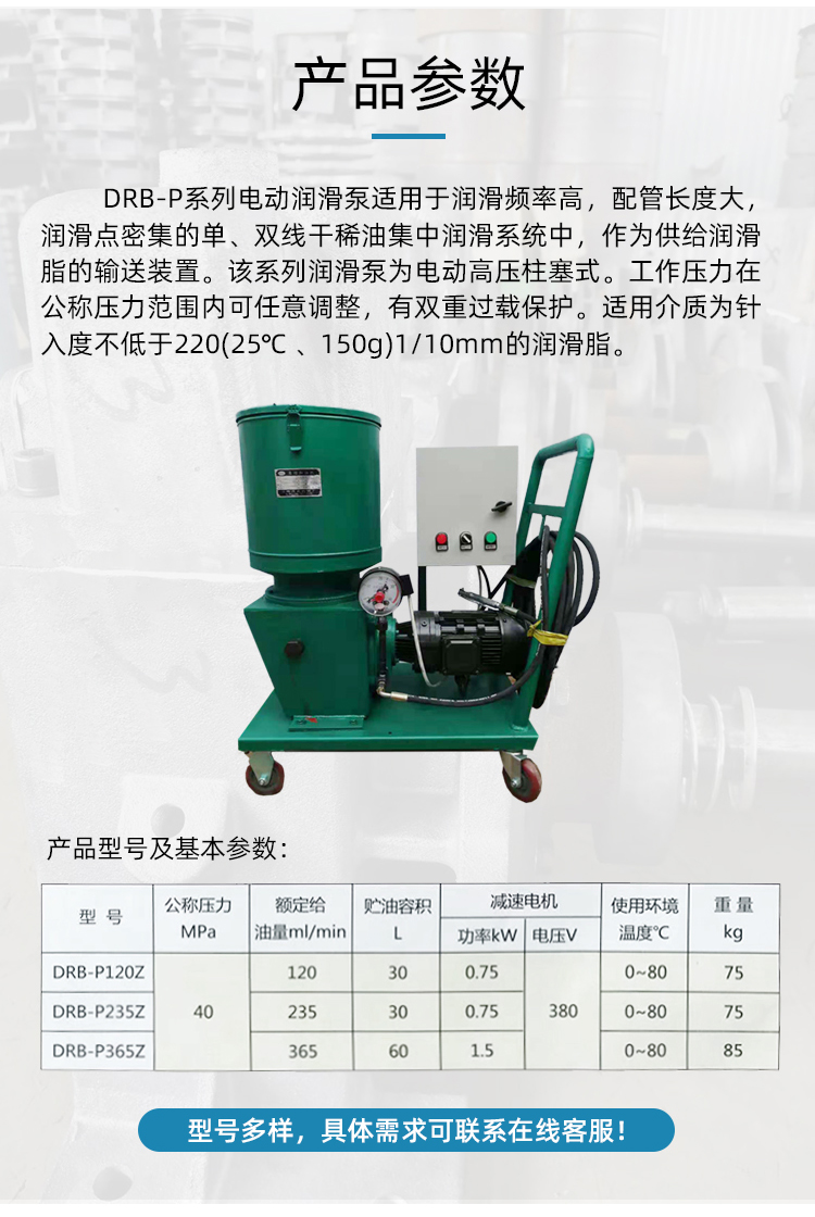 用途: DRB-P 型流(liú)動車式潤(rùn)滑泵适用(yòng)于潤滑頻(pin)率高、配管(guǎn)長、潤滑點(dian)分散㊙️不便(bian)于集中潤(rùn)滑的的大(da)型設備。該(gāi)系列潤滑(hua)泵為電動(dòng)♊高壓💔柱塞(sai)🏃🏻泵。